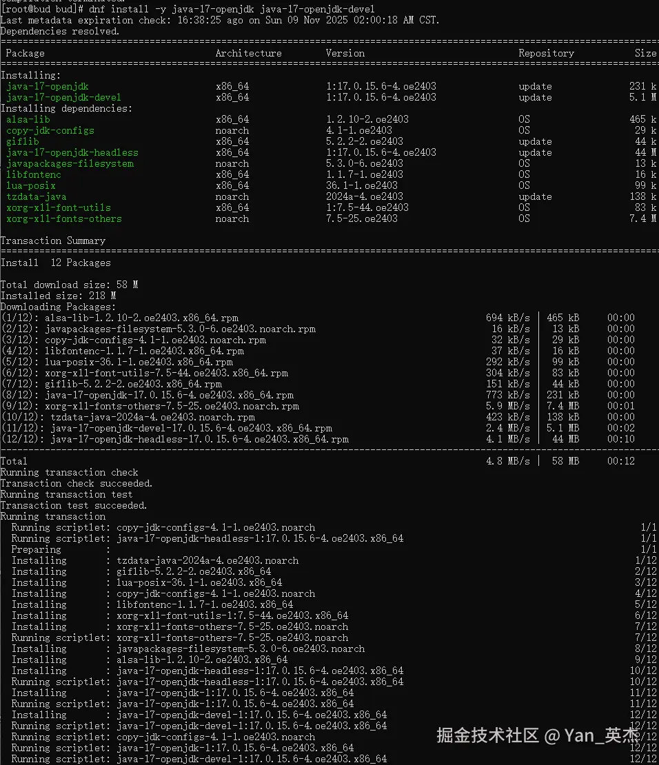 # 验证Java环境(实际输出对应版本:1:17.0.15.6-4.oe2403)