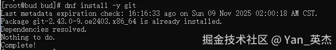 | 版本控制工具(git) | dnf install -y git | 2.43.0-9.oe2403(默认仓库) | 已预装 | 实测已预装,无需安装及解析依赖 |