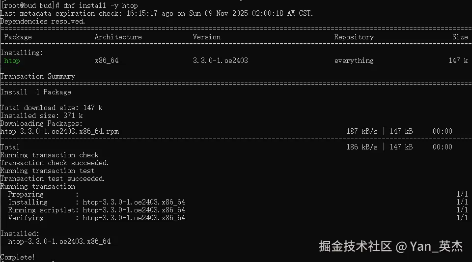 | 系统监控工具(htop) | dnf install -y htop | 3.3.0-1.oe2403(everything仓库) | 约1秒 | 无额外依赖,下载147k,安装371k |