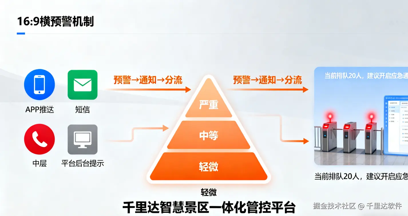 预警信息同步推送至 “千里达智慧景区一体化管控平台后台、运维人员专属 APP、运营负责人短信 / 电话”,同时在景区游客中心、闸机旁的工作人员终端显示,确保 “有人接、有人管”: