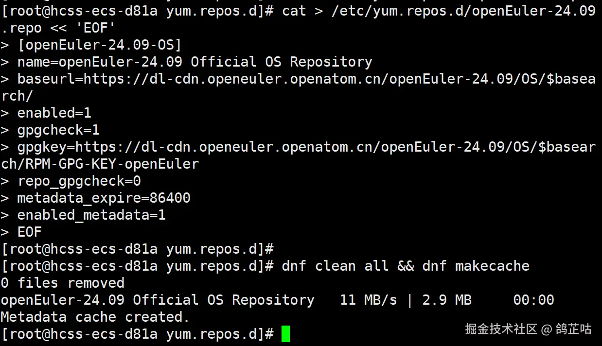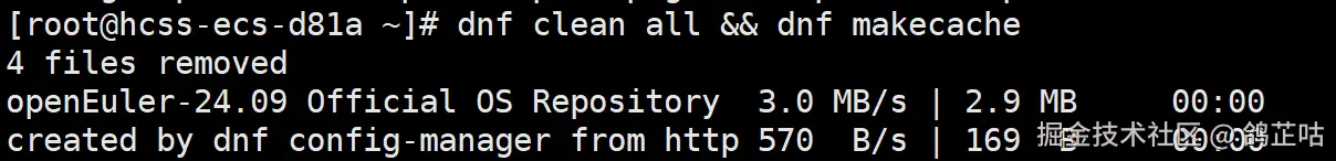 在这里我们可以看到,提示信息 “0 files removed” 表明此前的无效缓存已被彻底清理;而 “Metadata cache created” 则说明软件源连接正常,且元数据缓存已成功生成。同时,openEuler-24.09 Official OS Repository 也正常拉取了元数据(速度达 11 MB/s,下载量为 2.9 MB)。