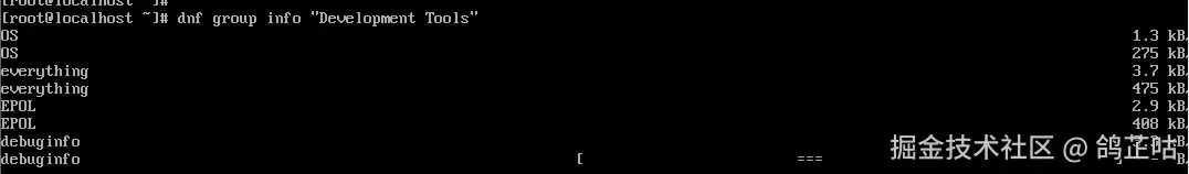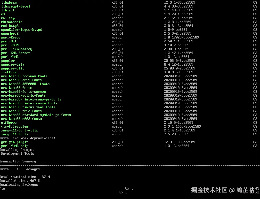 DNF 的组包管理功能可将场景所需的工具链打包为整体,实现 “一键部署”。例如,通过 “Development Tools” 组快速搭建编译环境: