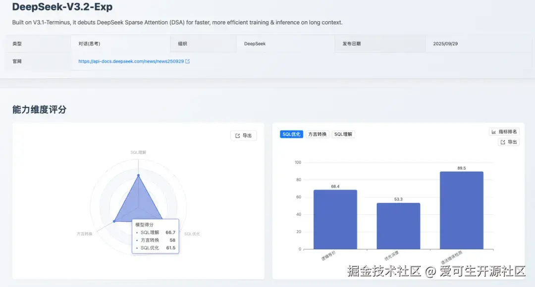 国产化潜力股:DeepSeek-V3.2-Exp 模型首次入榜,其在 「国产数据库转换」方面表现出强劲潜力(92.1),为国产化替代场景提供了新的高性能选择。
