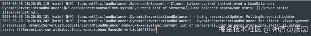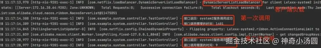 从调用日志可以看出,第一次调用System2服务,Ribbon的DynamicServerListLoadBalancer会将feign客户端进行负载,然后进行调用,第一次调用的时间就是会长一些,第二次调用直接进行请求可以看到调用时间很快。