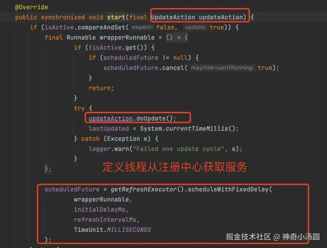 让我们看ServerListUpdater.start方法的实现,通过自定义线程去拿,这就是获取服务列表;