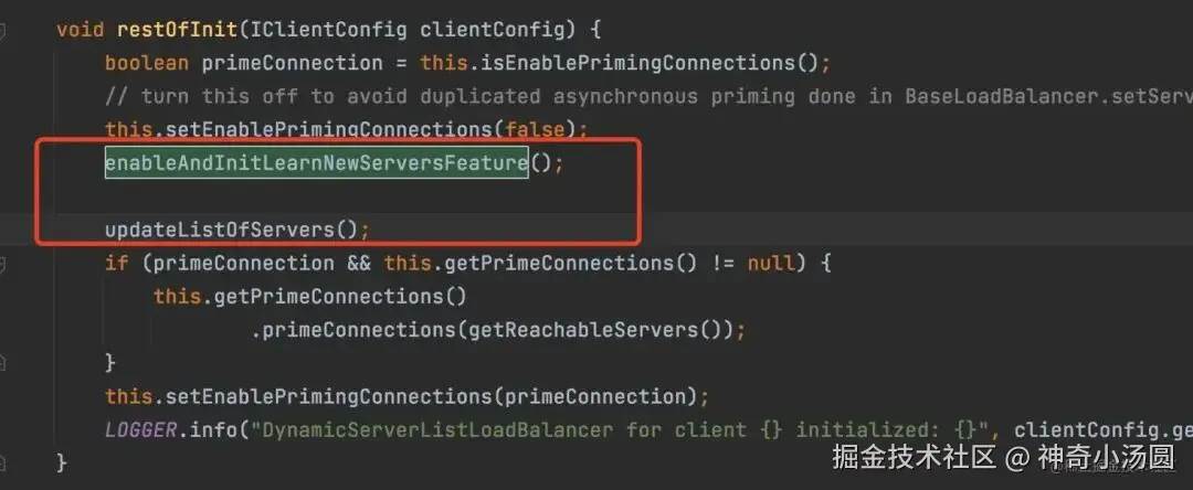 loadBalancer默认的是ZoneAwareLoadBalancer负载均衡器,通过继承父类DynamicServerListLoadBalancer的restOfInit方法,里面比较重要的两个方法,enableAndInitLearnNewServersFeature和updateListOfServers方法