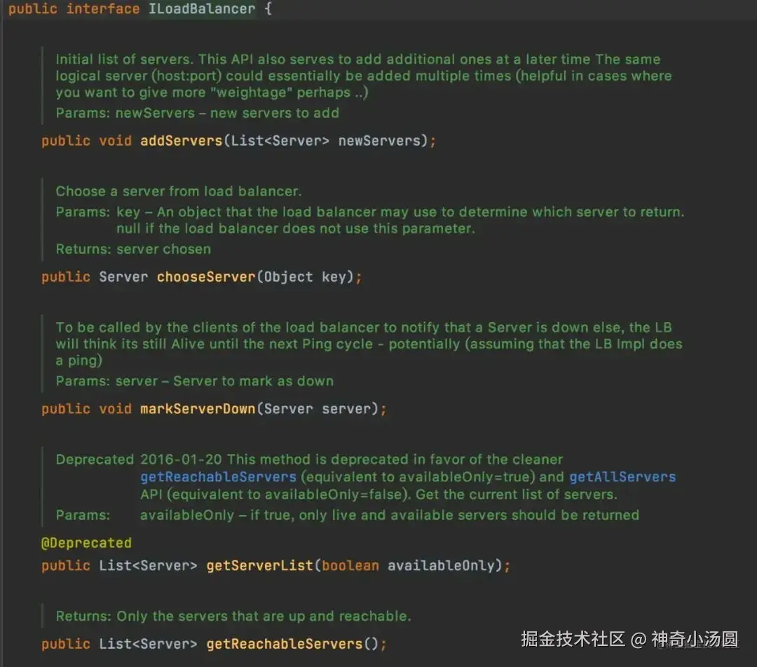 RibbonClientConfiguration类中通过LoadBalancer**,我们知道ribbon是靠LoadBalancer做负载的 无非就是ILoadBalancer接口的方法,依次是添加新的服务、在负载均衡里选择一个服务、markServerDown服务下线、获取服务列表、获取存活的服务器、获取所有服务器(包括健康和不健康的)
