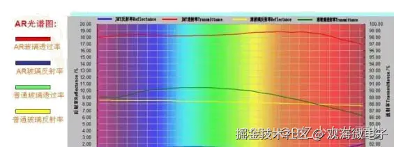 2. AR - anti-reflection,中文为抗反射增透,通过提高玻璃(屏幕)透光率,降低玻璃(屏幕)反射率达到增透目的。可选择材料比较多,一般用高低折射率材料交叉堆叠镀上去,可采用真空蒸发镀也可采用磁控溅射镀。
