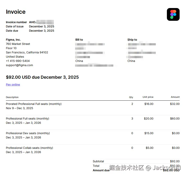 可是我是Figma新手没有注意到一些细节,后续邀请进入的小伙伴全是Full角色,所以就导致203=60美元的预付,上个月不是完整的月份按照比率折算的两个席位162=32美元。