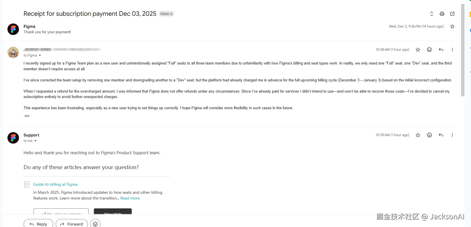 I would like to request a refund. Yesterday, the platform charged me in advance for the upcoming billing cycle (from December 3 to January 3 of next year). As a new Figma user, I wasn’t fully aware of how the platform works, which led to all three members of my Figma Team being assigned the "Full" seat type. However, we actually only need one "Full" seat, one "Dev" seat, and the third member doesn’t require a seat at all and can be removed from the team entirely.