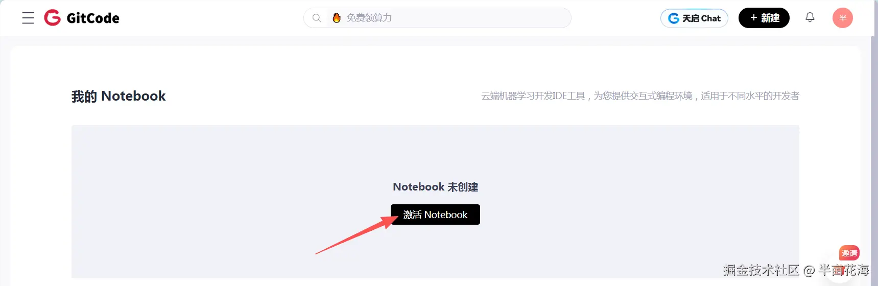 如果你是首次使用 GitCode 的云端 Notebook,系统会提示你激活 Notebook 环境,点击确认即可一键开通。