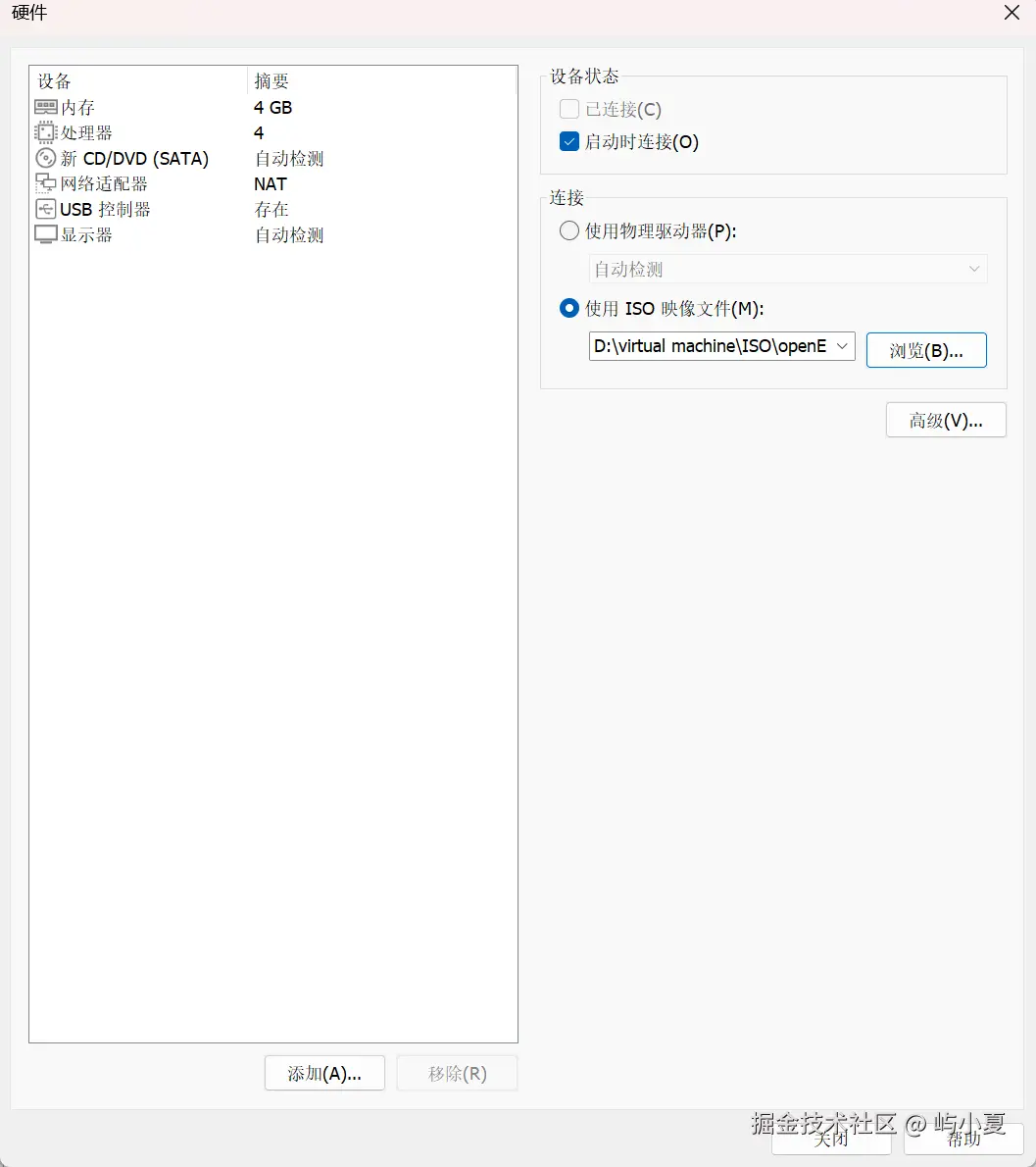 - CD/DVD(IDE)选择 使用 ISO 映像文件 → 指向下载的 ISO