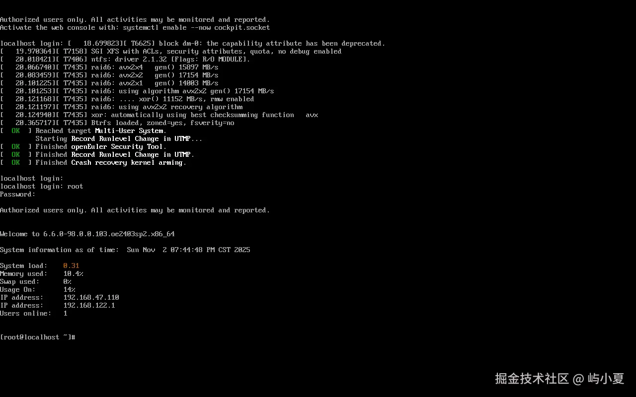 openEuler 默认采用 DNF包管理器,与主流 Linux 生态高度兼容。完成登录后,第一步是进行系统更新: