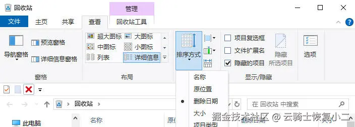 点击顶部菜单栏的“查看”>“排序方式”>“删除日期”。