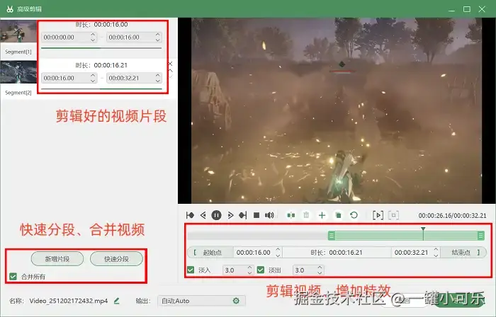 步骤3:录制结束后,可以直接用软件内置的 “高级剪辑” 功能,对游戏视频进行片段裁剪,还能添加特效,让游戏视频的呈现效果更出彩。