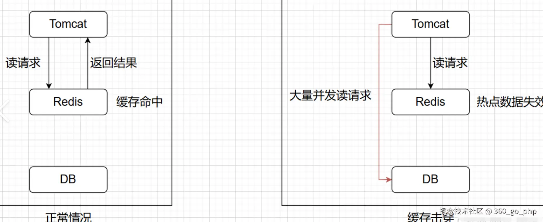 一般指缓存中没有,但是数据库中有该数据,缓存击穿一般是在同一段时间内访问同一个数据,该数据在缓存中超时失效,导致大量的请求直达数据库,导致数据库压力增大。