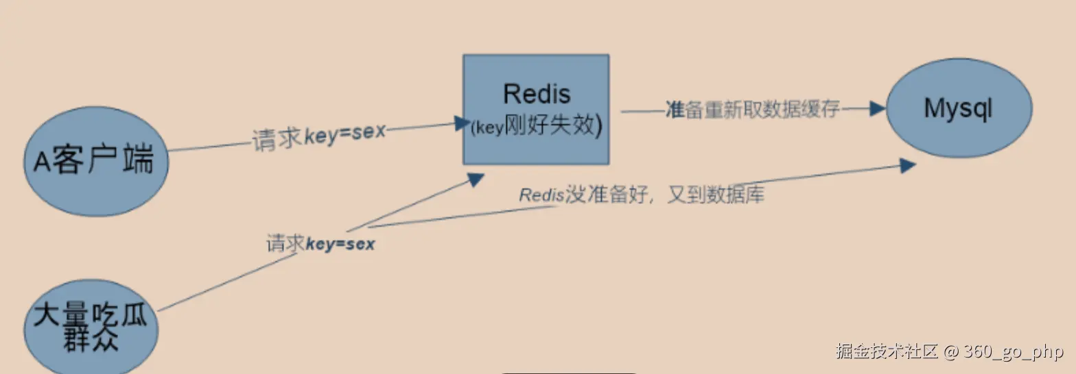 当服务器重启或者大量缓存集中在某一个时间段内失效,这样在失效的时候,如果有大量的请求访问缓存,由于缓存中的数据都失效了,就会到数据库中进行查找,导致数据库瞬间的访问量飙升,导致系统崩溃。
