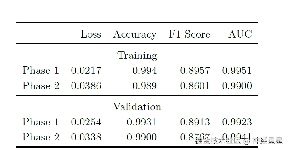 CNN 分类器在应用于 Phase 1 和 Phase 2 的训练集与验证集时的性能指标如下表所示: