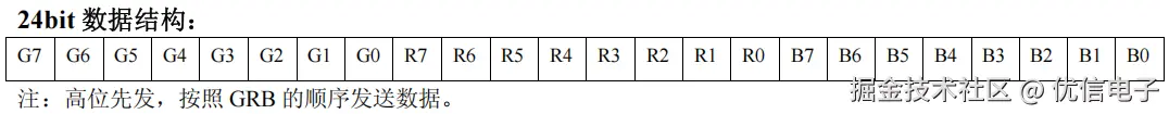 每个像素点需要 24 bit,按 G7…G0 → R7…R0 → B7…B0 的顺序依次发送。例如,要显示纯绿(255,0,0),主控会发送:11111111 00000000 00000000;其中 11111111 对应十进制 255 的绿色通道,高位先发。