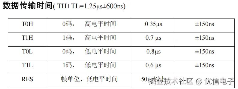 ‘0’ 码:高电平约 0.35 µs(±150 ns),低电平约 0.8 µs,总周期 ≈ 1.25 µs;