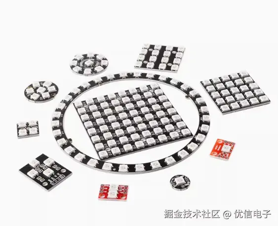 - 总线级联 WS2812 拥有内置信号整形功能,能将余下的数据完整透传至下一级,无需中断或额外控制。这使得在同一根数据线下,可以串联数十、乃至上千颗 WS2812,主控只需一次完整的数据发送即可更新整条链。