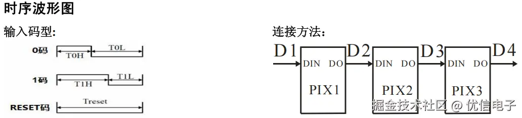 数据协议采用单线归零码的通讯方式,像素点在上电复位以后,DIN端接受从控制器传输过来的数据,首先送过来的24bit数据被第一个像素点提取后,送到像素点内部的数据锁存器,剩余的数据经过内部整形处理电路整形放大后通过DO端口开始转发输出给下一个级联的像素点,每经过一个像素点的传输,信号减少24bit。像素点采用自动整形转发技术,使得该像素点的级联个数不受信号传送的限制,仅仅受限信号传输速度要求。