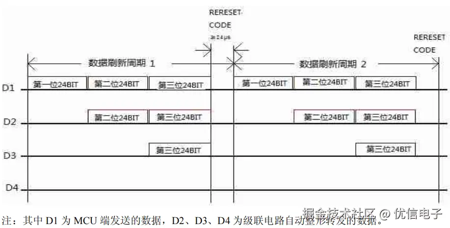 通过上述工作原理与协议解读,在有多个led级联的情况下,先发送第一个led的数据,后第二个、第三个、以此类推。