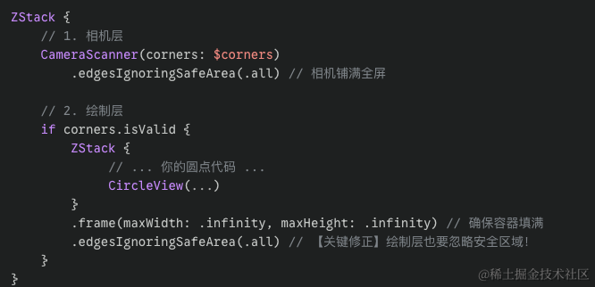 绘制层:如果你的 SwiftUI 绘制层没有显式忽略安全区域,SwiftUI 默认会把 (0,0) 放在安全区域内部(刘海下方)。这导致相机认为的点 (100, 100) 在 SwiftUI 看来应该画在更靠下的位置。