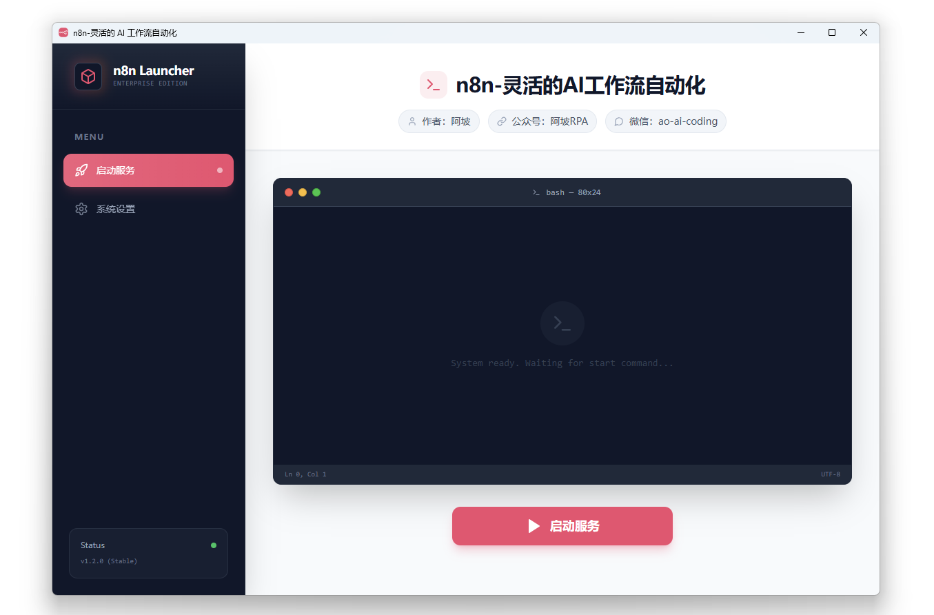 安装完成后,运行软件,直接点击 “启动服务” 按钮即可。启动器会自动检测 Docker 服务状态,若未运行则会提示您启动 Docker。检测通过后,n8n 服务将自动在后台启动。