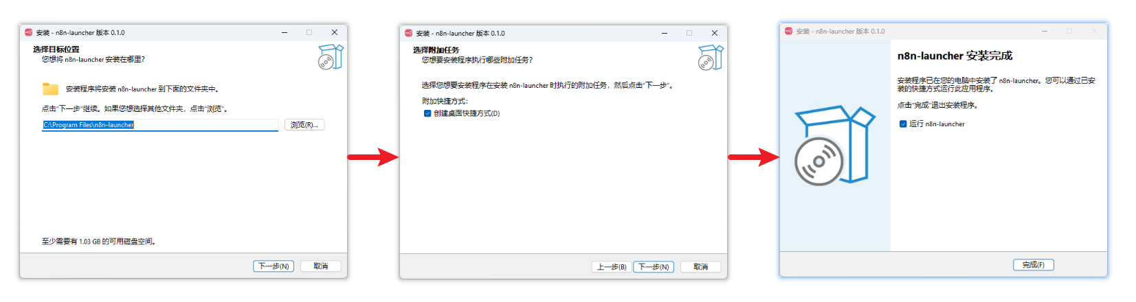直接双击运行 n8n一键启动器_win_setup.exe。n8n 的 Docker 镜像已内置在安装包中,因此请确保安装目录所在磁盘剩余空间大于 1GB。