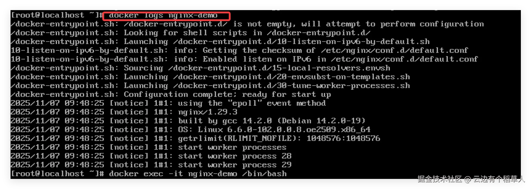 在容器运行过程中,用户可能需要进行日志查看、进入容器等操作,openEuler中Docker的操作命令与标准Docker完全一致,无需额外学习:
