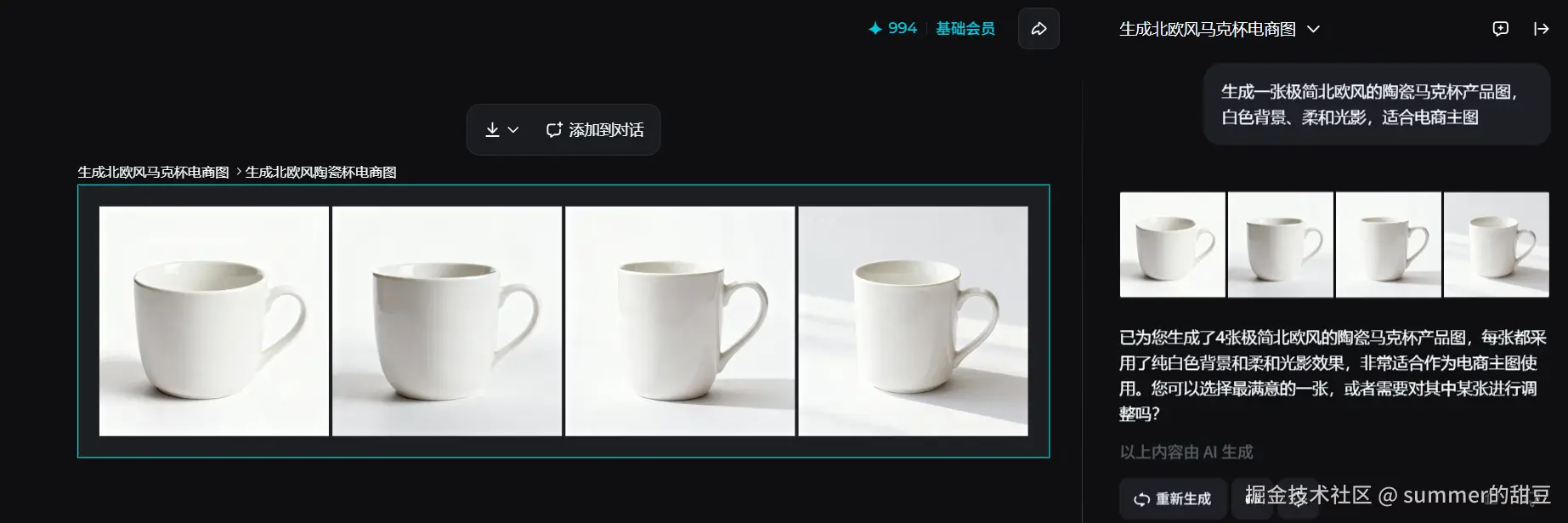 “生成一张极简北欧风的陶瓷马克杯产品图,白色背景、柔和光影,适合电商主图。”