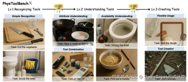 PhysToolBench 数据集包含超过 1,000 条图像–文本样本,覆盖日常生活、工业操作、户外作业与专业场景等多种环境,旨在评估模型在物理工具识别、理解与创造方面的能力。数据依据任务复杂度划分为易、中、难三个等级,并构建三类核心任务:工具创造、工具识别与工具理解。