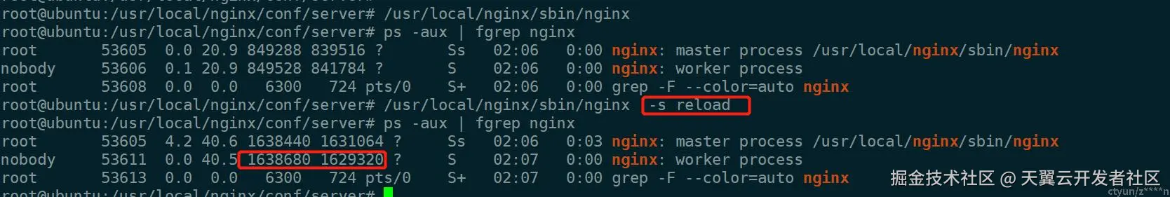 2.由于master进程reload时,是先用一个全新的结构体解析配置后,再free释放到原有配置的结构体。所以master进程再reload过程,会短暂的保持2个结构体(内存2倍),再变为1个全新配置结构体(内存正常)。所以猜测2倍的原因和这个原理有关,很可能是内存泄漏,没有释放原有结构体。
