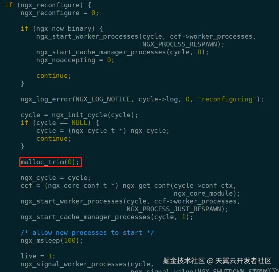 在 src/os/unix/ngx_process_cycle.c 中 解析完新配置释放旧的配置的结构体后,增加一行 malloc_trim(0)后,重新编译。再次启动nginx, reload后,观察内存不会翻倍
