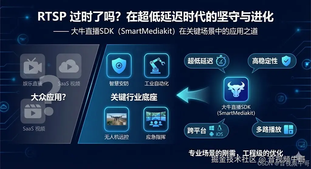 而像大牛直播SDK(SmartMediakit)这种面向行业的专业 SDK,正是在不断打磨 RTSP 在这些“关键应用场景”中的表现,通过更稳、更快、更兼容、更容易集成的特性,让这个诞生于上世纪的协议在今天依旧发挥关键作用。