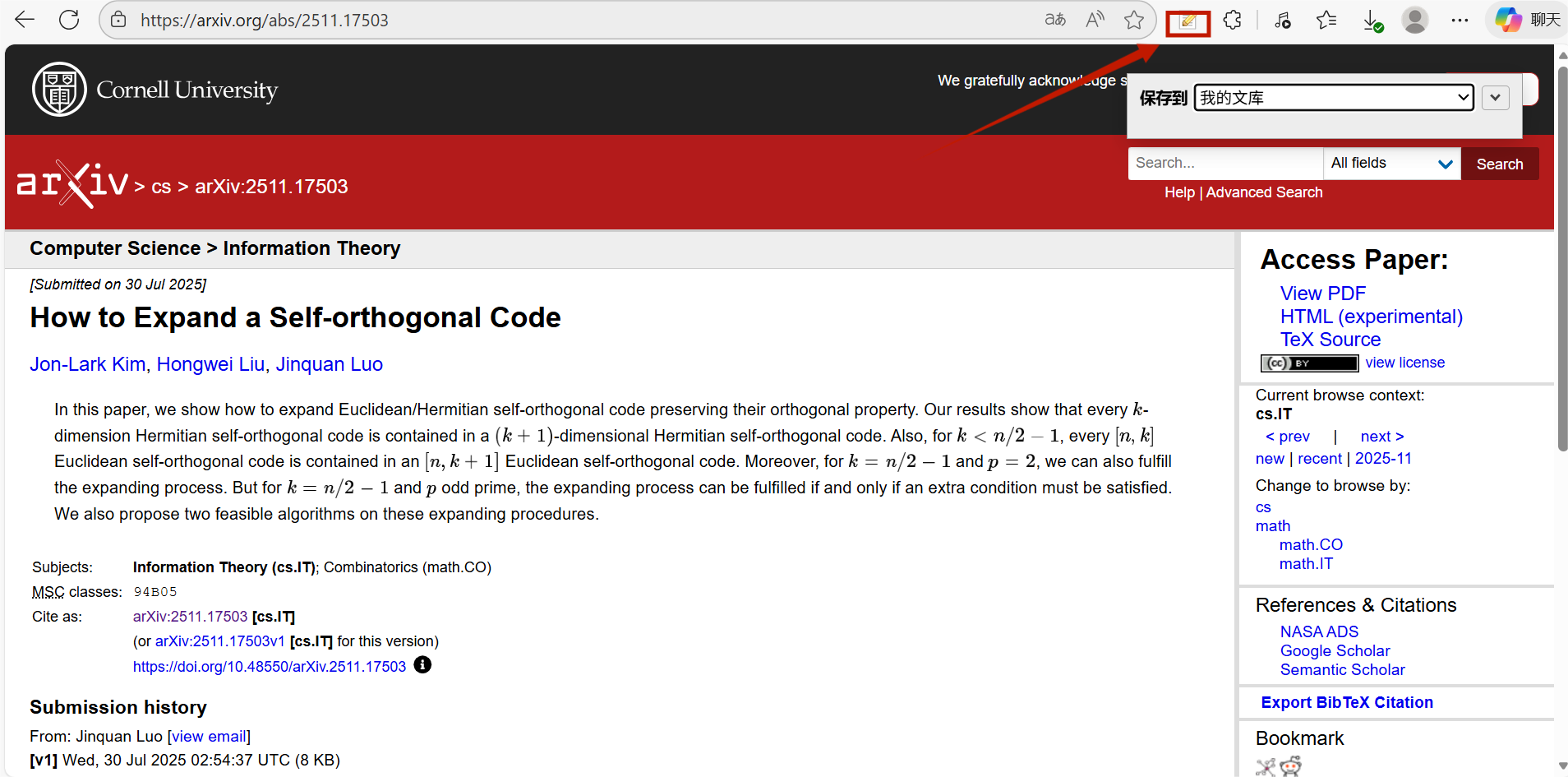 您可以随机打开一个arxiv上的文章,点击扩展即可显示保存到我的文库中,也可以可以保存到其他文件夹中。