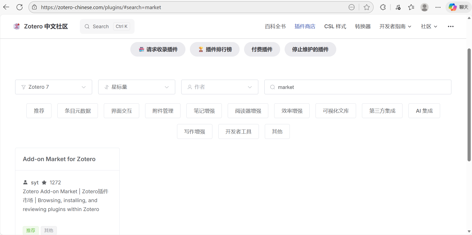 进入Zotero的中文社区,点击插件商店。首先下载插件Add-on Market for Zotero,此插件类似于一个插件商店(其他插件要依赖这个)