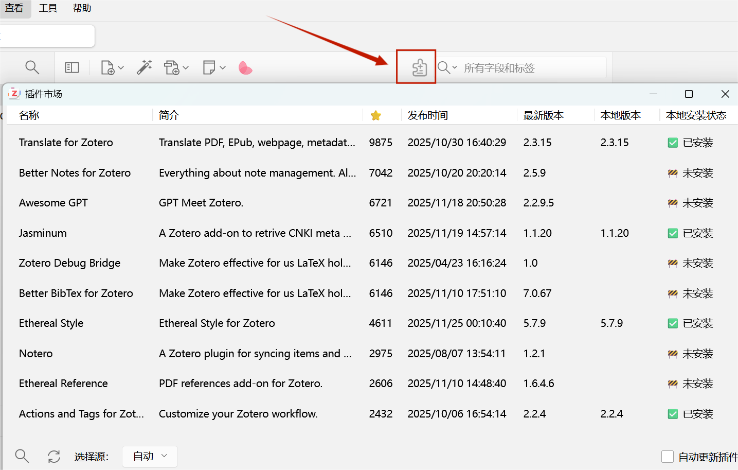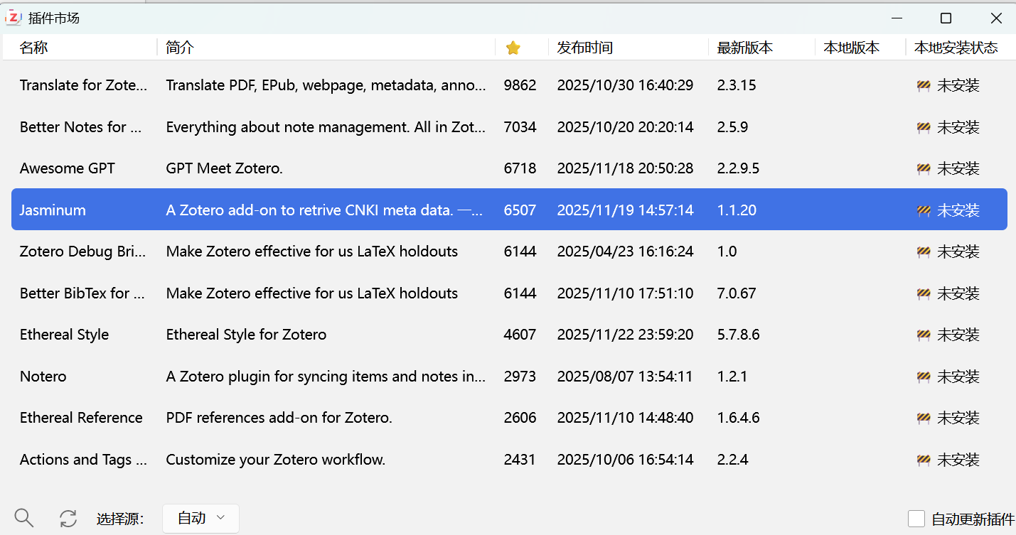 下图我们以安装Jasminum(茉莉花) 插件为例进行展示,该插件可以抓取知网上文章。首先,在插件市场找到Jasminum(茉莉花) 插件。