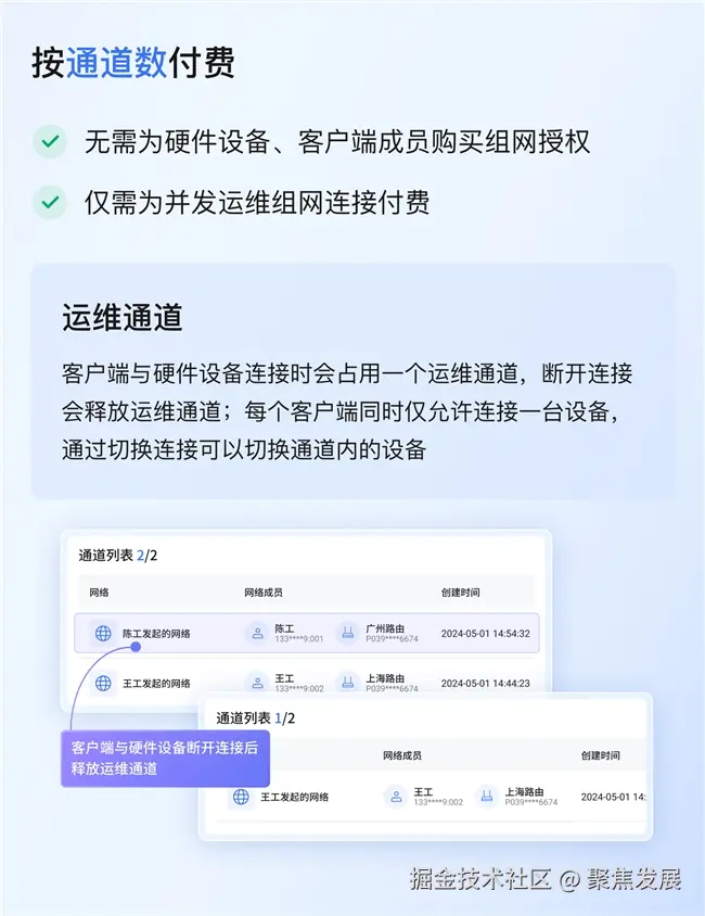 这种模式打破了设备数量与成本的强关联,企业仅需根据实际同时在线运维的人数购买通道,无需为大量的硬件设备或客户端成员支付额外授权费,真正实现按需投入,降低运维成本。