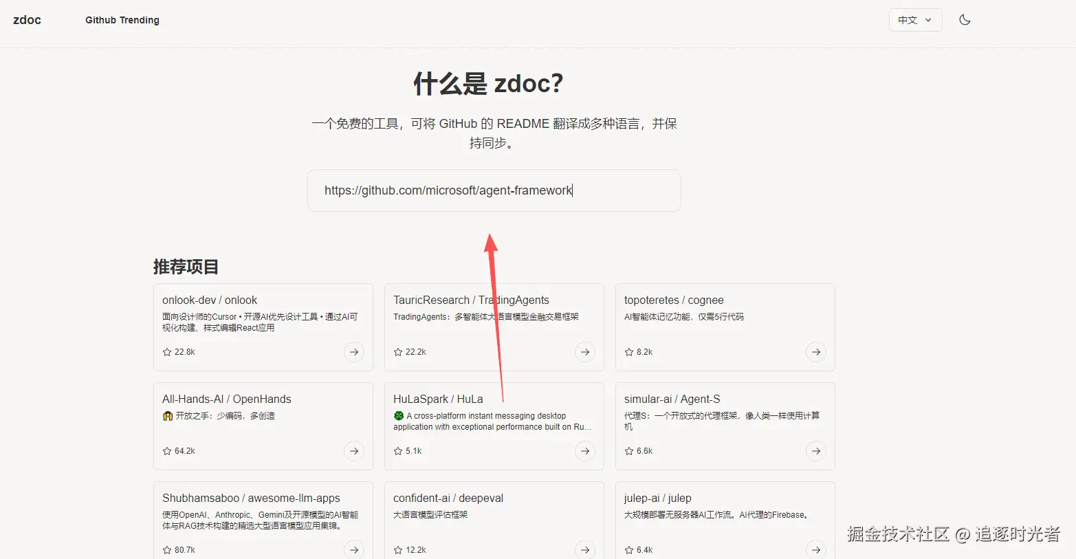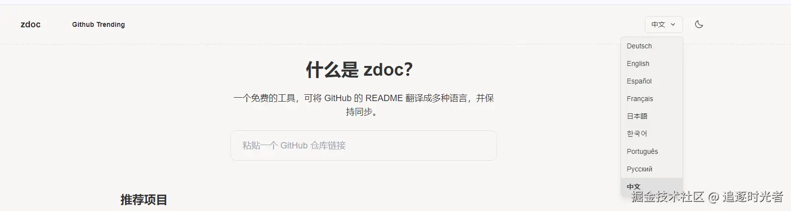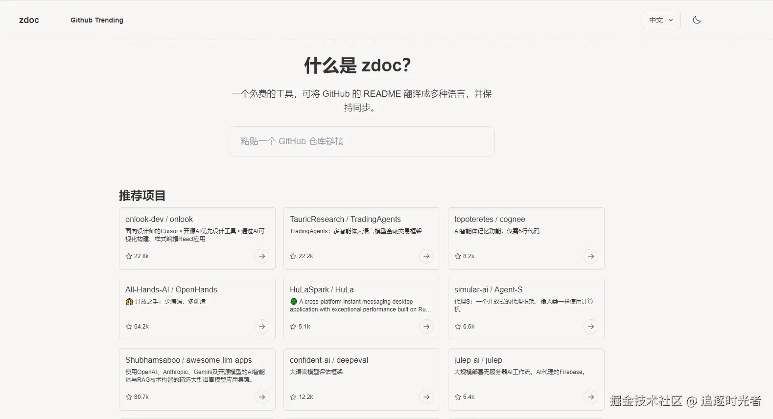 ZDoc 是一个免费且实用的在线工具,其核心功能是将 GitHub 仓库中的 README 自动翻译成多种语言,帮助开发者轻松将 GitHub 项目 README 介绍翻译成多种语言,降低理解成本,提升协作效率。