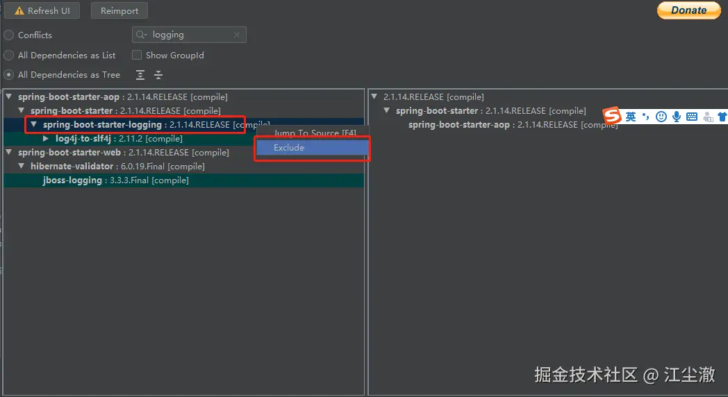 3.在搜索的结果中展开找到spring-boot-starter-logging,右键选择Exclude即可。