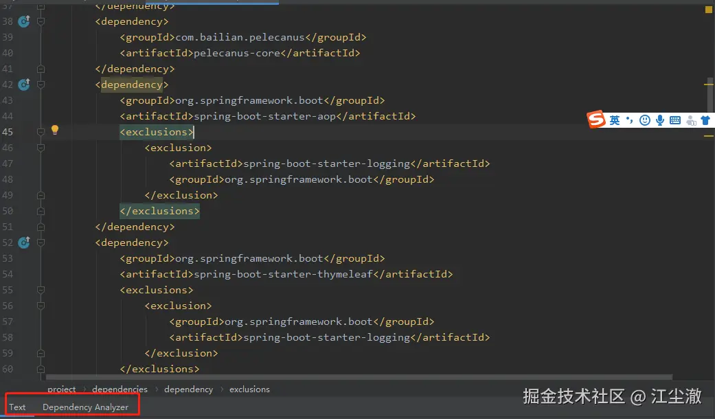 4.切换回text视图可以看到在spring-boot-starter-aop的依赖中已经排除了spring-boot-starter-logging依赖了。