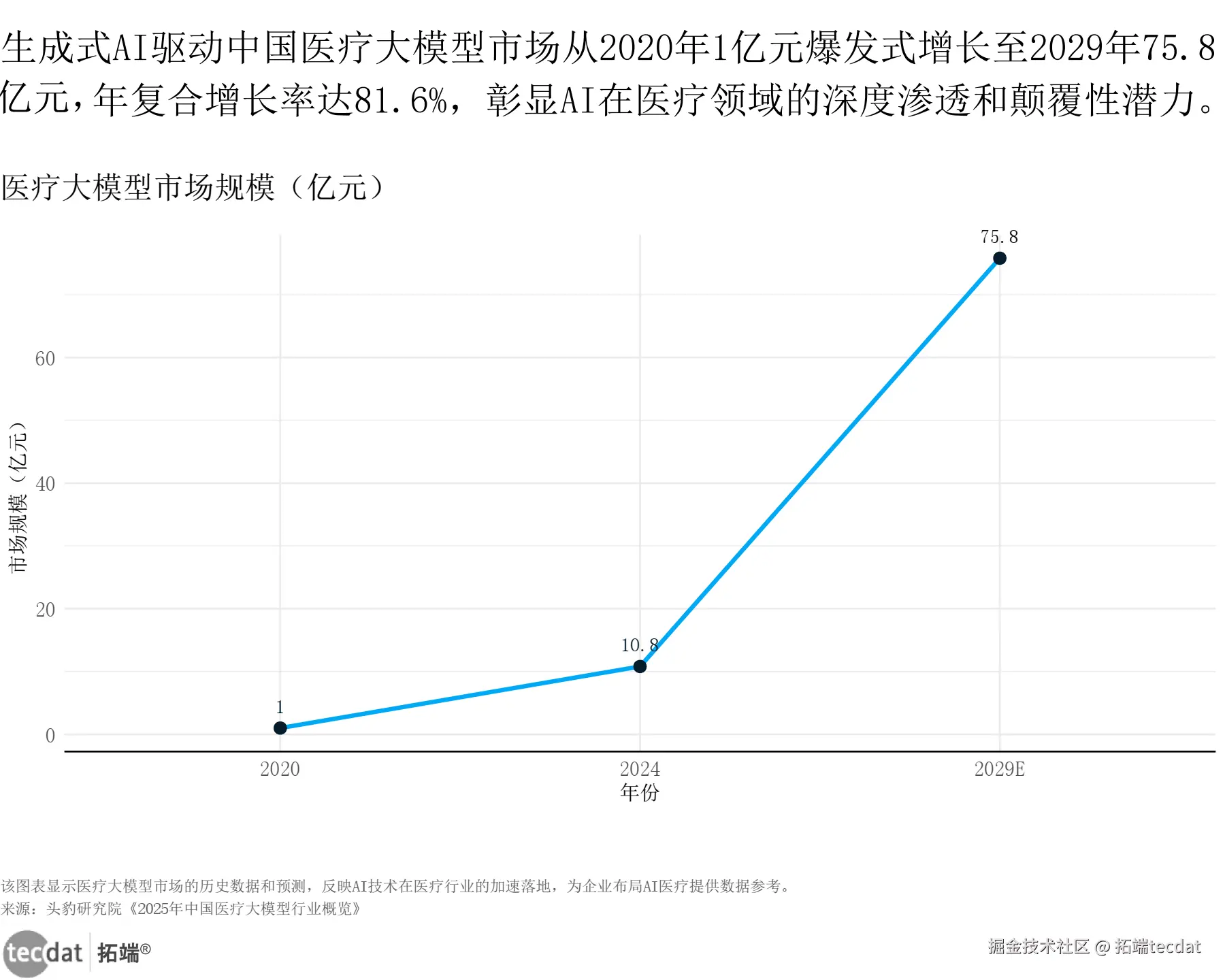与美国形成鲜明对比的是,中国医疗健康行业正借助AI技术与国际化战略打开增长空间。2020-2024年,中国医疗大模型市场规模从1.0亿元飙升至10.8亿元,年复合增长率达81.6%,预计2029年将突破75.8亿元。