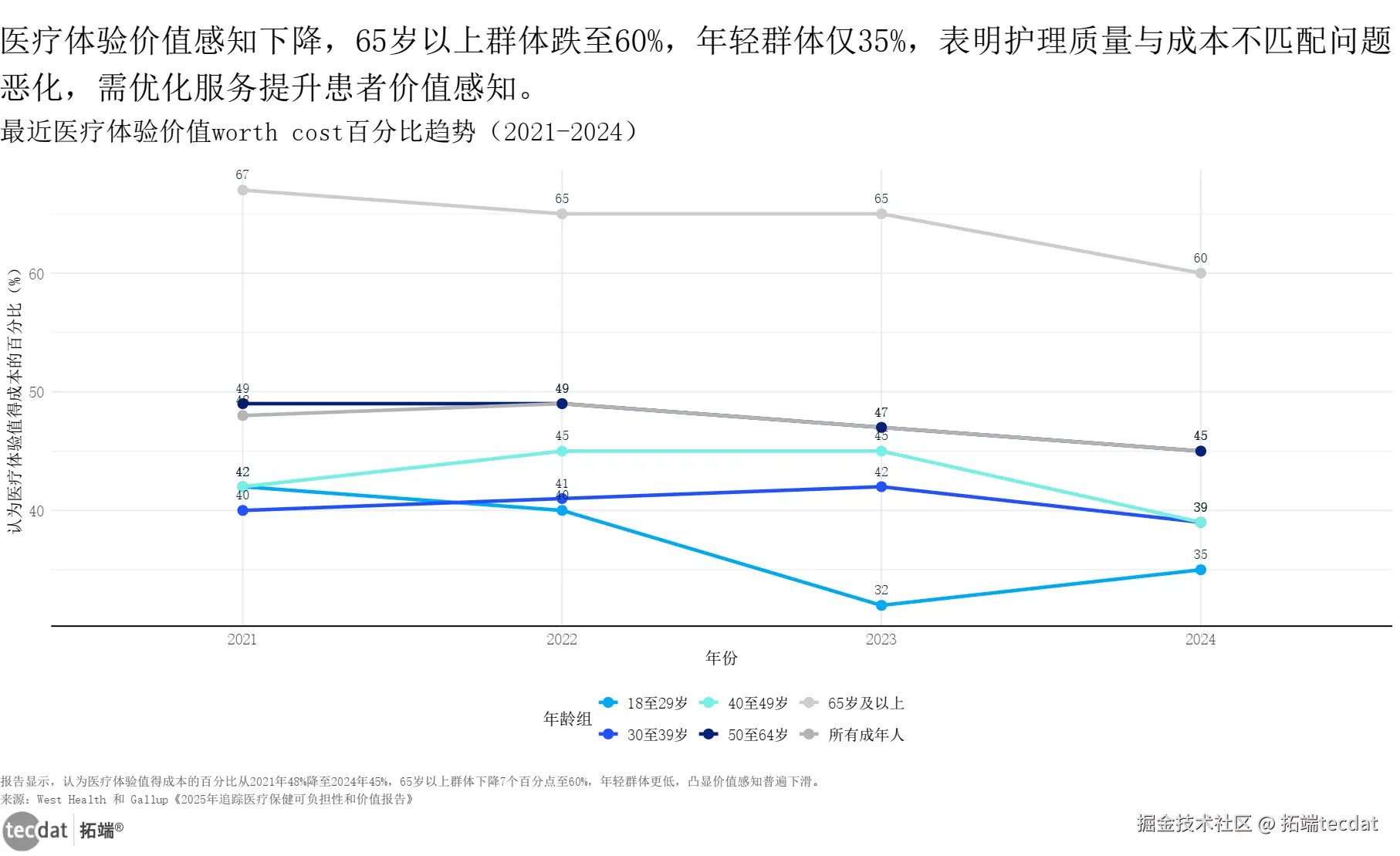 更值得关注的是,患者对最近医疗体验的“价值认可”比例持续下降,2024年美国仅45%的成年人认为医疗体验“物有所值”,18-29岁群体仅35%,较2021年下降7个百分点;65岁以上群体从67%降至60%,是所有年龄组中降幅最大的群体之一。