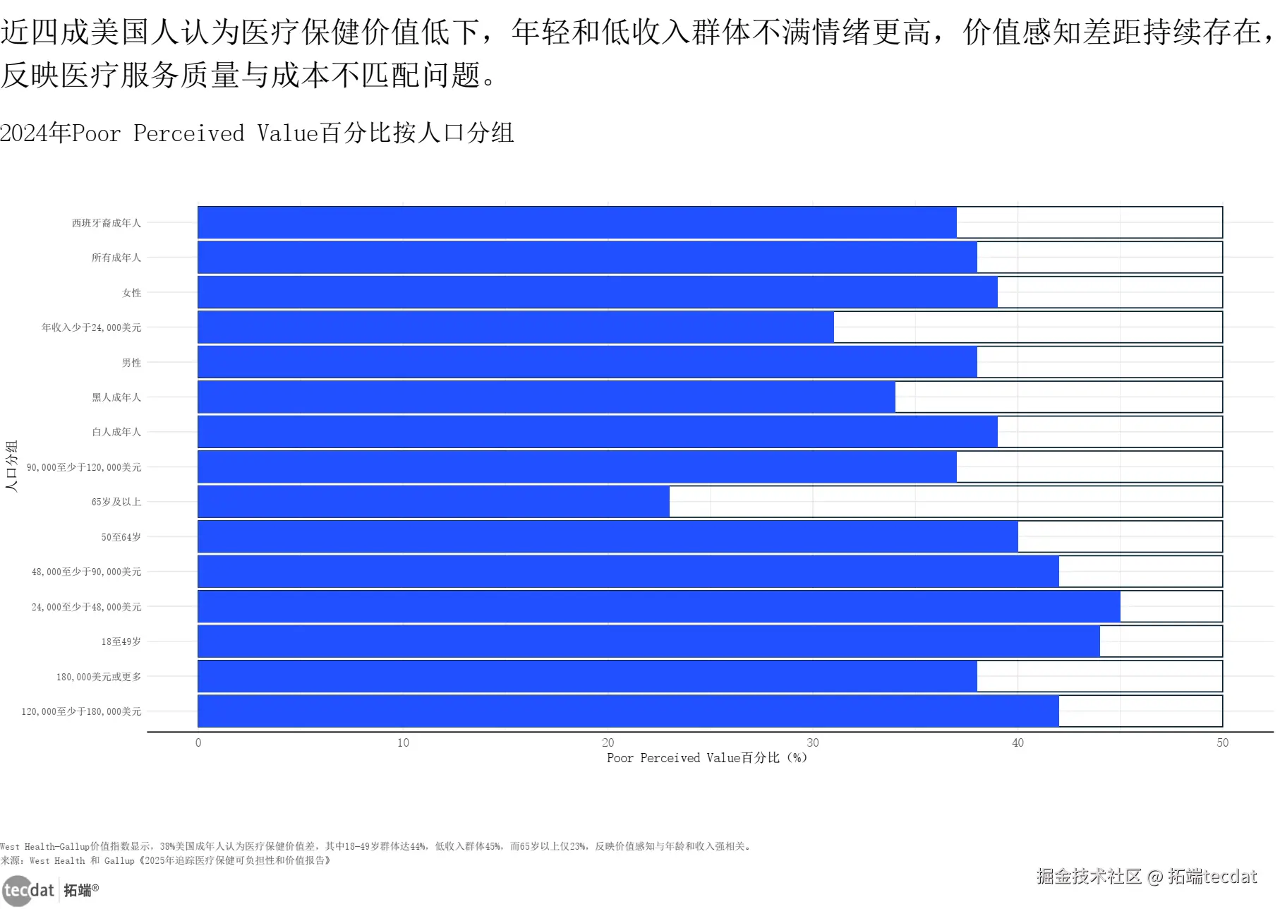 38%的美国成年人认为医疗保健“价值低下”,18-49岁群体这一比例达44%,是65岁以上群体(23%)的近2倍。患者对医疗价值的不满主要源于“成本高”与“体验差”,68%的患者认为医疗服务“性价比不足”,44%的患者吐槽“就医流程繁琐”。