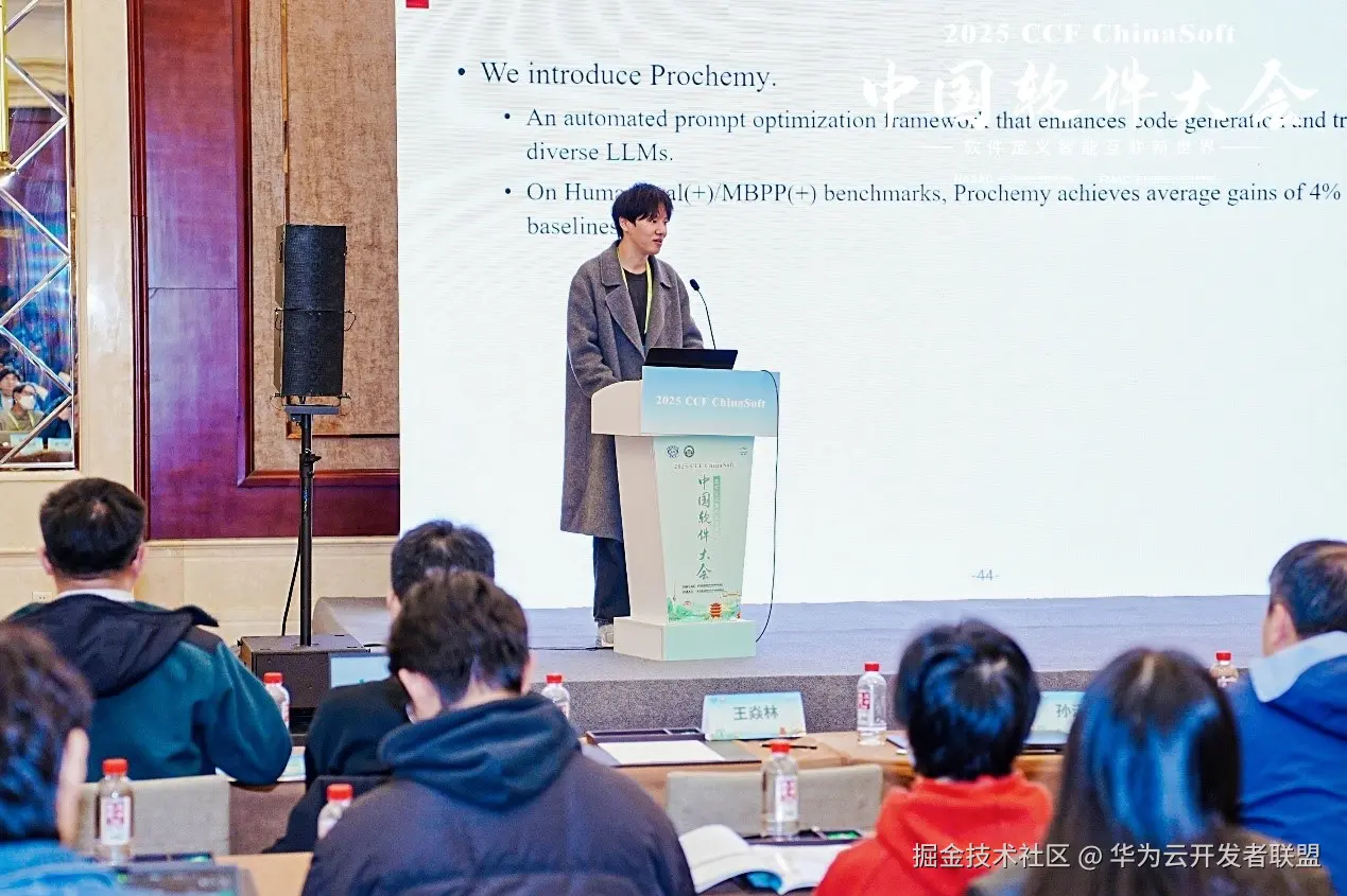 然后中国科学院软件研究所孙泽宇老师的报告围绕 “自动化提升代码生成效果的提示优化方法”展开,旨在解决当前大语言模型在代码生成任务中对高质量 Prompt 依赖度高、人工 Prompt 难以稳定满足规范化需求等问题。主讲人首先指出,传统人工构造的提示词往往无法兼顾模型偏好与代码质量要求,在真实软件工程场景中易导致生成结果不稳定、风格不统一或效果欠佳。因此,一个能够自动生成、自动优化 Prompt 的框架十分必要。为此,报告提出了 Prochemy——一种面向代码生成的自动化 Prompt 优化方法。该方法具备“自动化”“可兼容”两大目标。Prochemy 通过从零样本 Prompt 起步,利用任务数据生成训练样本,并在此基础上进行迭代优化,包括 Prompt 变异、结果评估、加权打分以及优胜选择等步骤,使模型能在多轮反馈中逐渐获得最优的提示词配置。实验方面,项目在 HumanEval、MBPP、LiveCodeBench 以及 CodeNet 等多个主流代码生成与翻译数据集上进行了系统测试,覆盖 GPT-3.5、GPT-4o、Claude、DeepSeek 等多种 LLM。对比基线包括 APE、OPRO 等单轮优化方法,以及 AgentCoder、CodeCoT 等多轮自协作方法。结果表明,Prochemy 在主流基准测试上实现了平均 4%-8% 的性能提升,验证了其在不同模型与任务上的普适性与有效性。此外,报告进一步展示了 Prochemy 在推理类模型(如 o1-mini)上的表现,证明其在复杂推理需求下仍具有改进能力。
