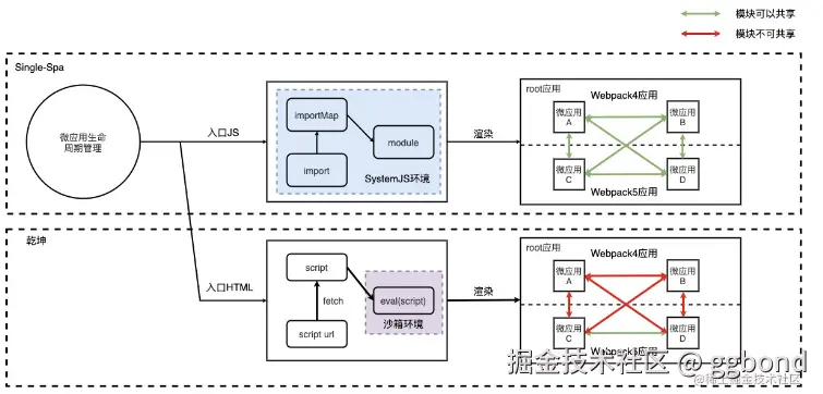 乾坤: 基于single-spa,加强了微应用集成能力,却抛弃了微模块的能力(微应用加载器:"微"的粒度是应用,也就是HTML(或main.js),它只能做到应用级别的分享)。
