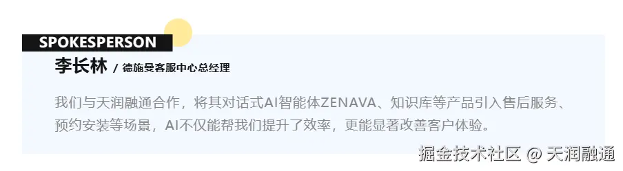 我们与天润融通合作,将其对话式AI智能体ZENAVA、知识库等产品引入售后服务、预约安装等场景,显著提升了客户体验。