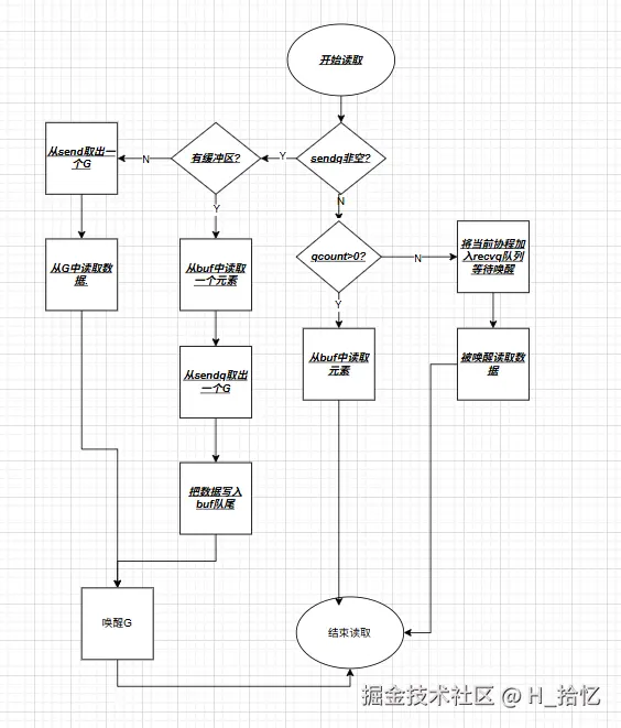缓冲区没数据.则从当前协程加入recvq队列.进入睡眠等待写协程唤醒.